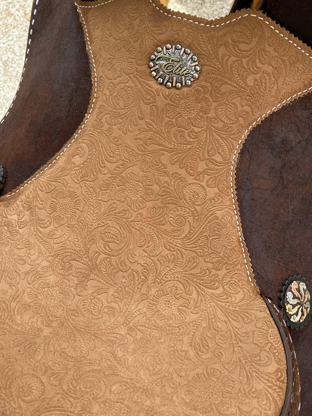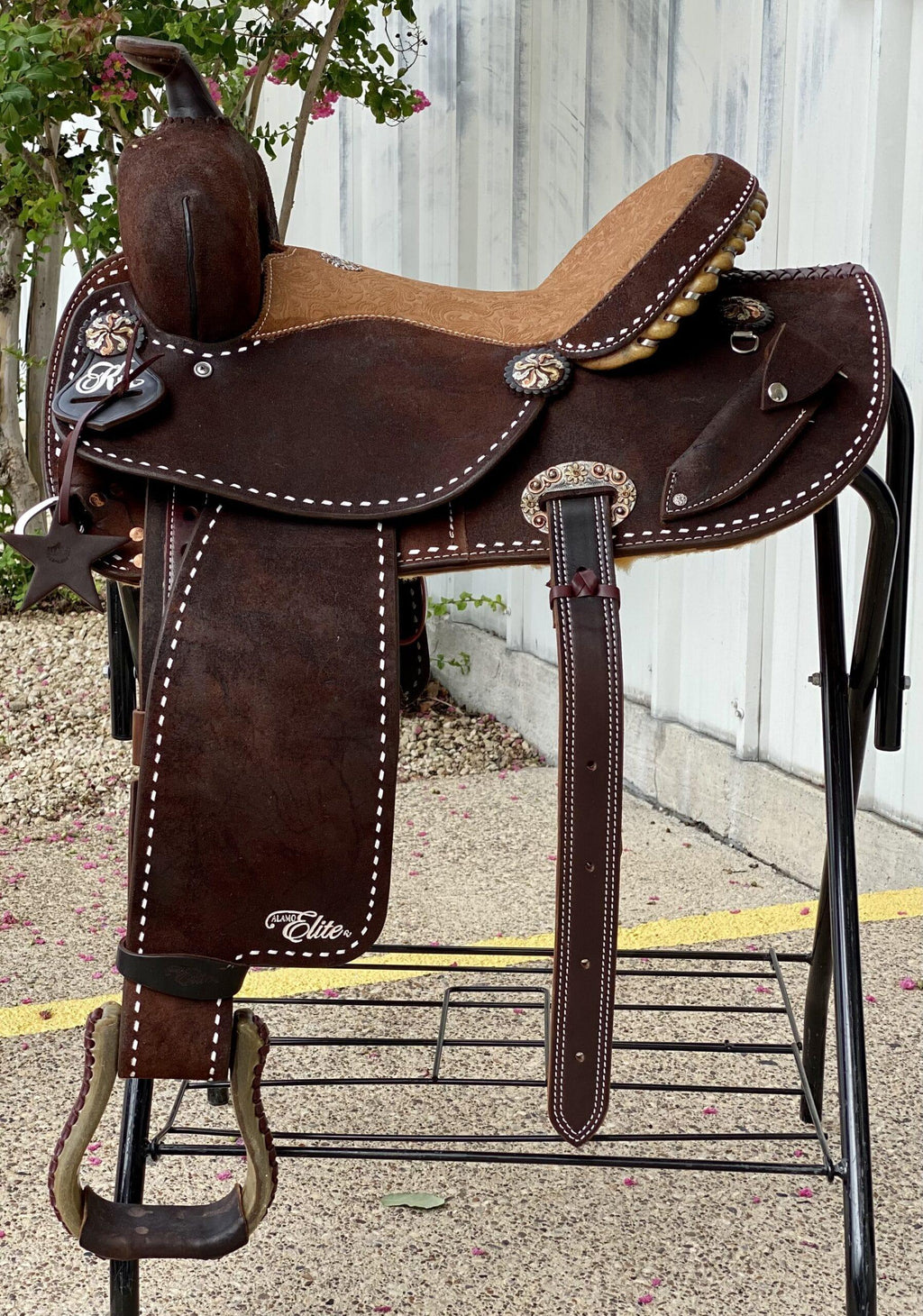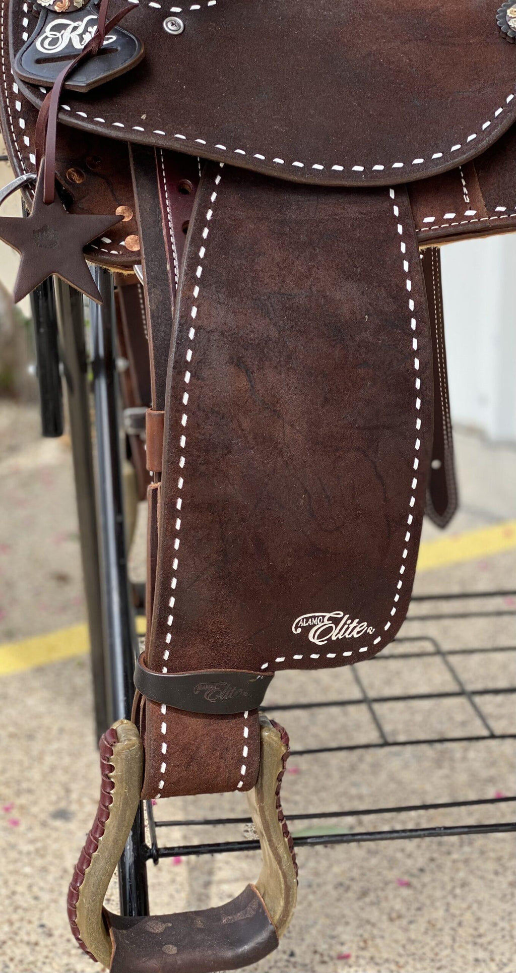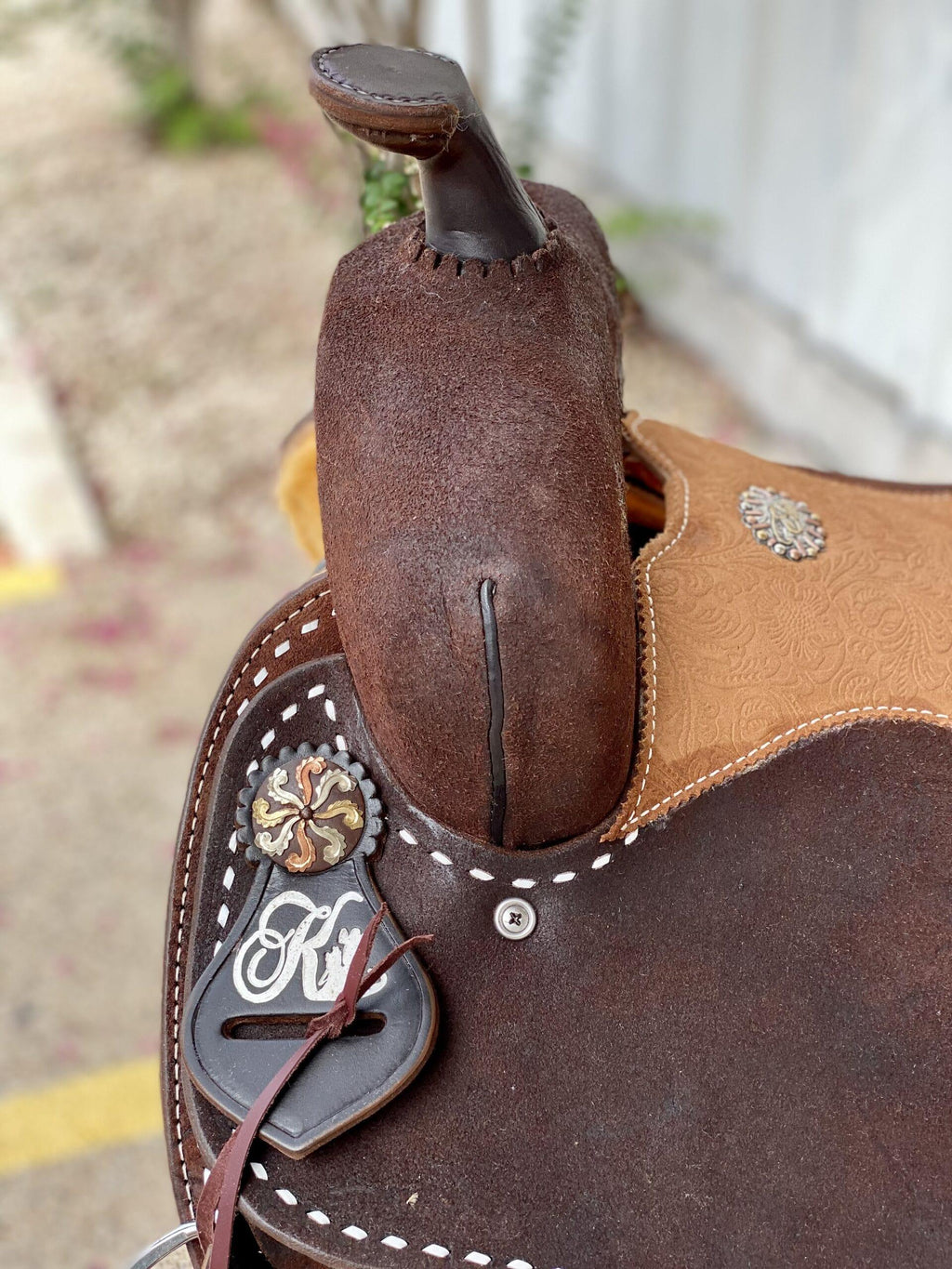 Brought to you by Kim Thomas. This (tree) design goes back to the 1980s and it is a modified BUSTER WELCH TREE with a FLATTER SEAT and LOWER CANTEL. The forward balance ride is designed to help you keep your feet straight or forward, eliminating any tipping forward. Also, the shorter horn is designed for the perfect hand fit and safety will allow you to adjust your position comfortably and securely. This saddle is all hand-designed done in chocolate buffed-out leather that is heavily oiled. The seat is a tan embossed seat that offers an amazing grip as well, on the Cheyenne roll cantle. Full White single buckstitch is bordered throughout this barrel. The skirt is round and comes with a hoof pick. It comes with a rawhide-covered stirrup and the B4 concho set. Also includes matching hobble straps and flank! These saddles are for the competitive barrel racer, someone who in it for the long haul! Also, written by Our Alamo Elite members! ONLY CHANGE REQUEST WE GET IS THAT CUSTOMERS WOULD LIKE A NORMAL 3.5IN” HORN, which is easy to do, please state so in the notes at checkout.
