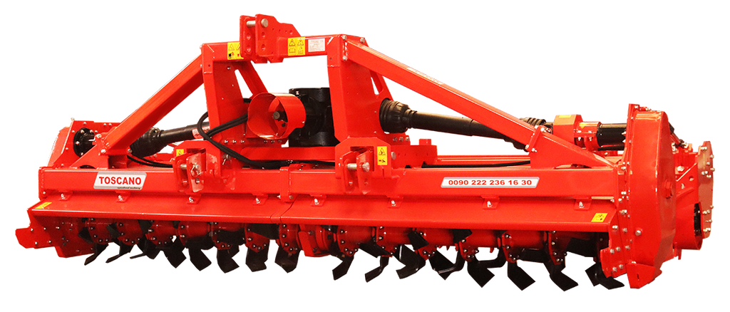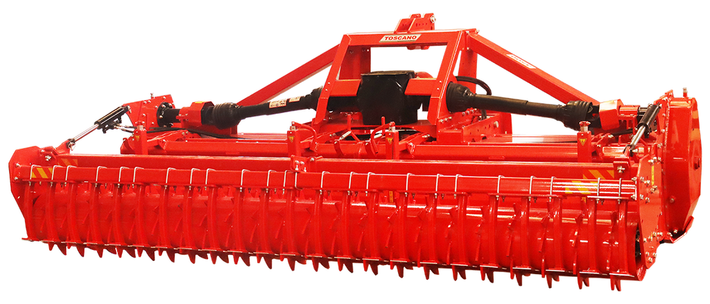 The Toscano Stoneburier Rotary Tiller is a specialized agricultural machine designed for rocky and stony fields, offering superior soil preparation and seedbed creation. With horizontally rotating blades that efficiently mix soil from the bottom to the surface, this tiller buries stones below 0.66 Ft of the field surface, creating the perfect environment for sensitive seeds. Its backward-turning rotor crumbles the soil to the maximum level while the packer roller ensures a smooth and flat surface, enhancing seed-to-soil contact for optimal germination.The Toscano Stoneburier Rotary Tiller operates efficiently with tractors requiring 60-150 kW / 80-200 HP, ensuring compatibility with a variety of farming setups and delivering reliable performance across rocky and stony terrains.